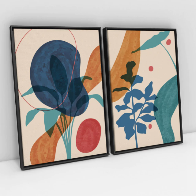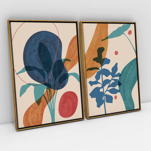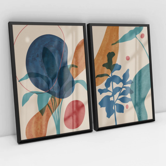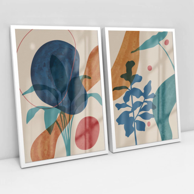 Quadro Decorativo Abstrato Botanical Abstract Leaves Art Kit com 2 Quadros