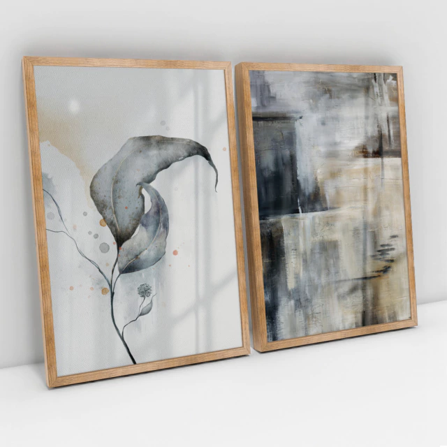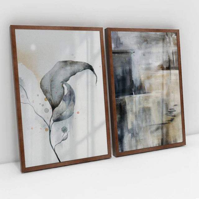Quadro Decorativo Abstrato Folha e Textura em Tons de Cinza Kit com 2 Quadros