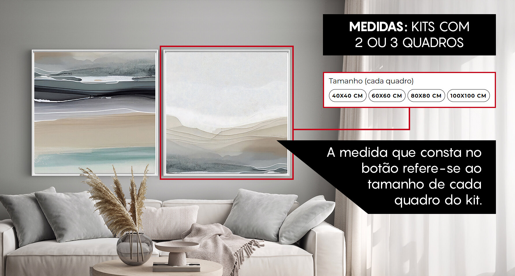 As medidas apresentadas são referentes a cada quadro. Por exemplo: se você escolher a medida 60 x 40 cm, em um kit de 3 quadros, isto significa que cada quadro do trio possui esta medida.