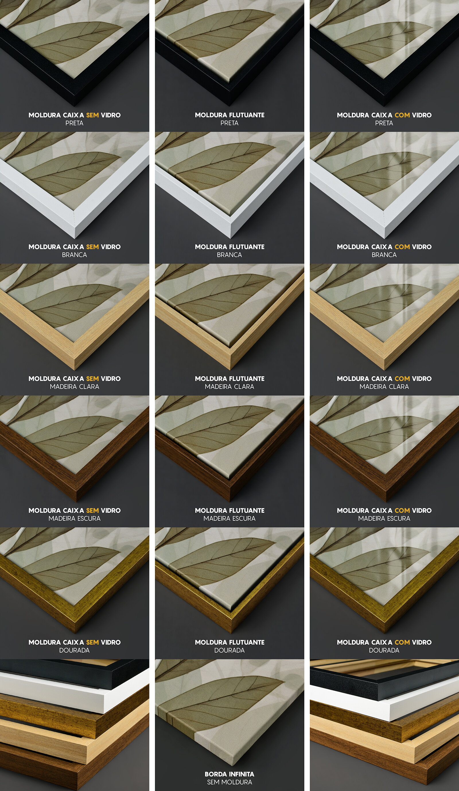 Você pode optar por quadro com ou sem vidro. Sem vidro, usa-se a moldura flutuante; com vidro, usa-se a moldura caixa.