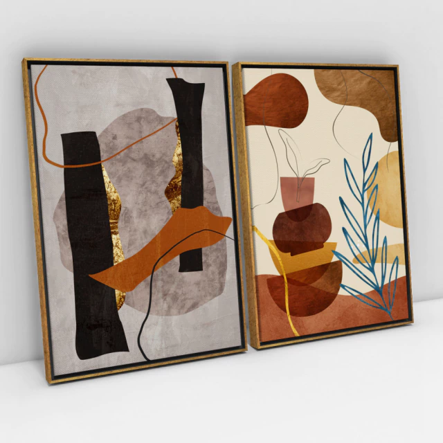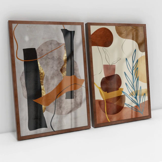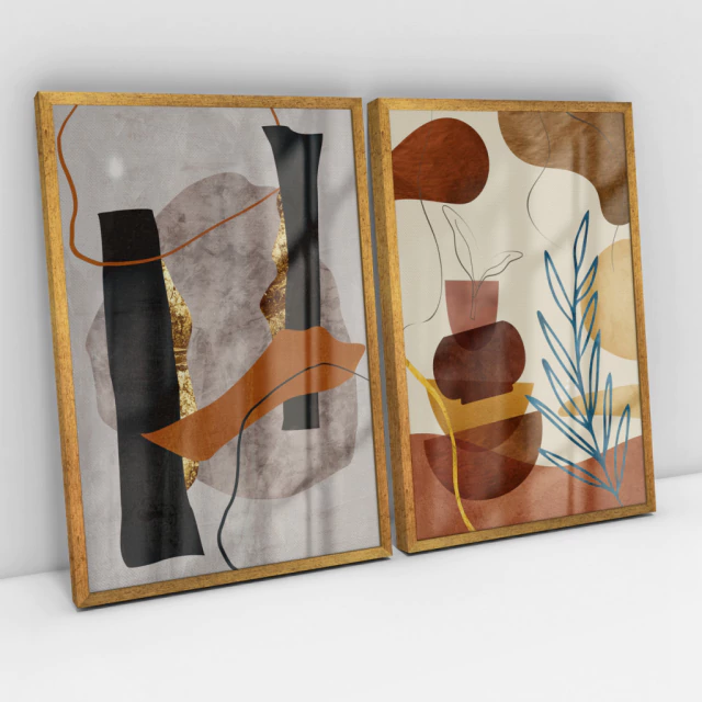 Quadro Decorativo Abstrato Rochas, Vasos, Plantas e Curvas - Uillian Rius - Kit com 2 Quadros