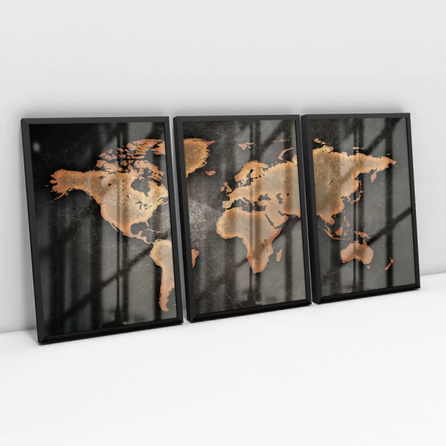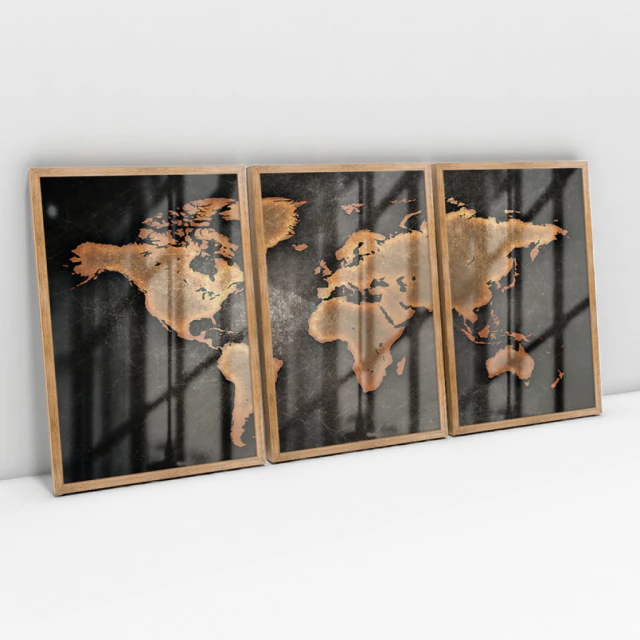 Quadro Decorativo Mapa Mundi Preto e Bronze Envelhecido Kit com 3 Quadros