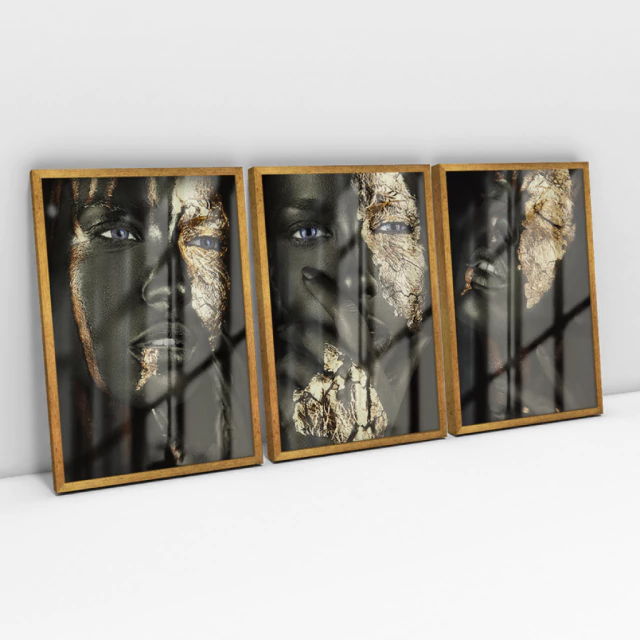Quadro Decorativo Mulher Negra e Dourada Kit com 3 Quadros